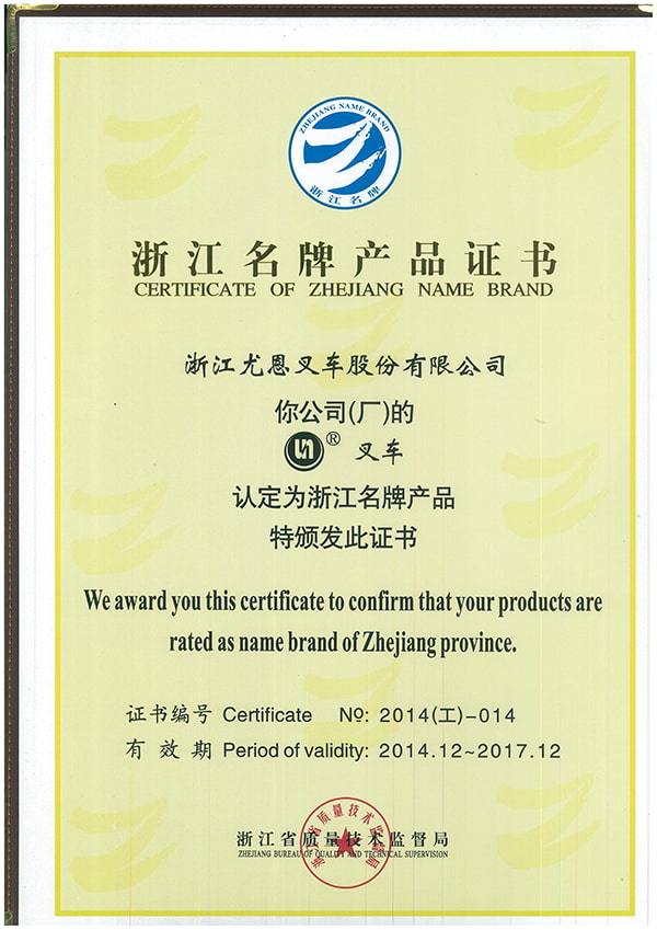 UN Forklift wurde mit dem Zhejiang Famous Brand Product Certificate ausgezeichnet, das vom Zhejiang Bureau of Quality and Technical Supervision ausgestellt wurde. Dieses Zertifikat ist die berühmte Markenanerkennung für Unternehmensprodukte aus Zhejiang.